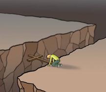 啊哈!谁料,前边忽然出现了一个又深又宽的沟壑!沟上没有桥,周围也没有路。也没有蜘蛛侠或者超人出来解救他…